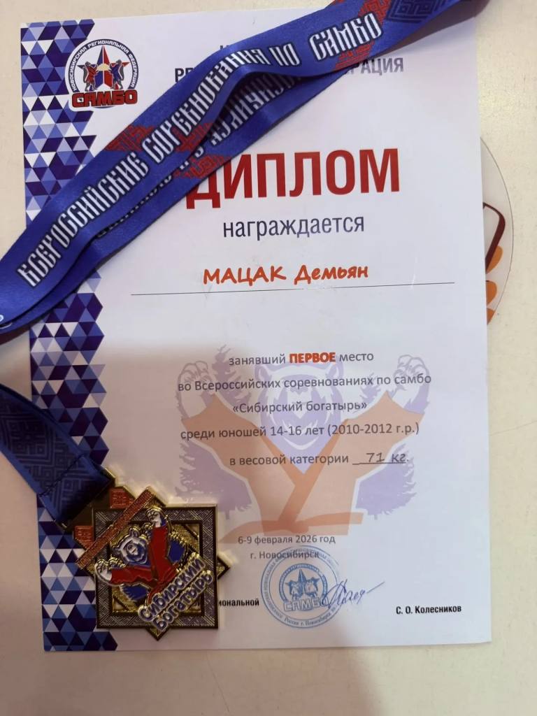 С 6 по 8 января 2026 года в г. Новосибирске состоялись Всероссийские соревнования по самбо «Сибирский богатырь», в которых участвовали юноши 2010-2012 годов рождения. Представлял спортивную школу спортсмен из Северо-Енисейского муниципального округа — Демьян Мацак.